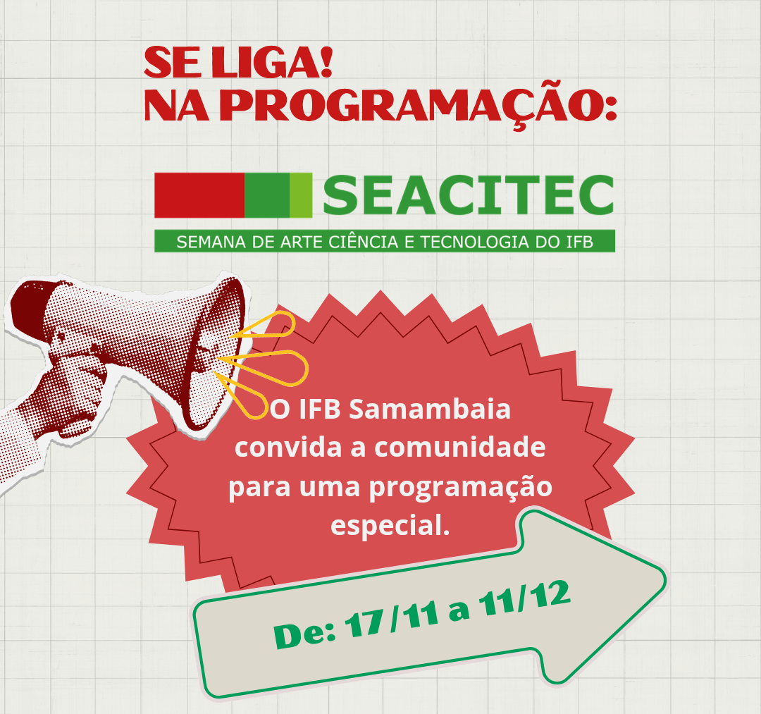 O IFB Campus Samambaia convida toda a comunidade escolar para participar da Semana de Arte, Ciência e Tecnologia (Seacitec 2025) – Edição Oficinas e Minicursos. A Semana de Arte,...