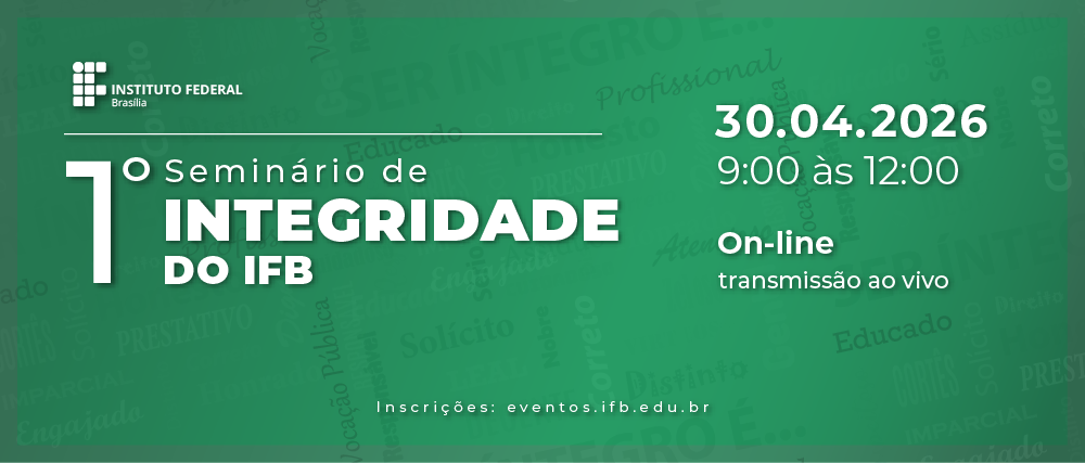 A Unidade de Gestão da Integridade, Transparência e Acesso à Informação (UGITAI) está organizando o I Seminário de Integridade do IFB. O evento acontecerá na quinta, 30 de abril, das 9h às 12h, com transmissão ao vivo pela TV IFB. A atividade também será certificada pela Pró-Reitoria de Gestão de Pessoas (PRGP) e as inscrições estão abertas pelo Sistema Eventos do IFB (https://eventos.ifb.edu.br).